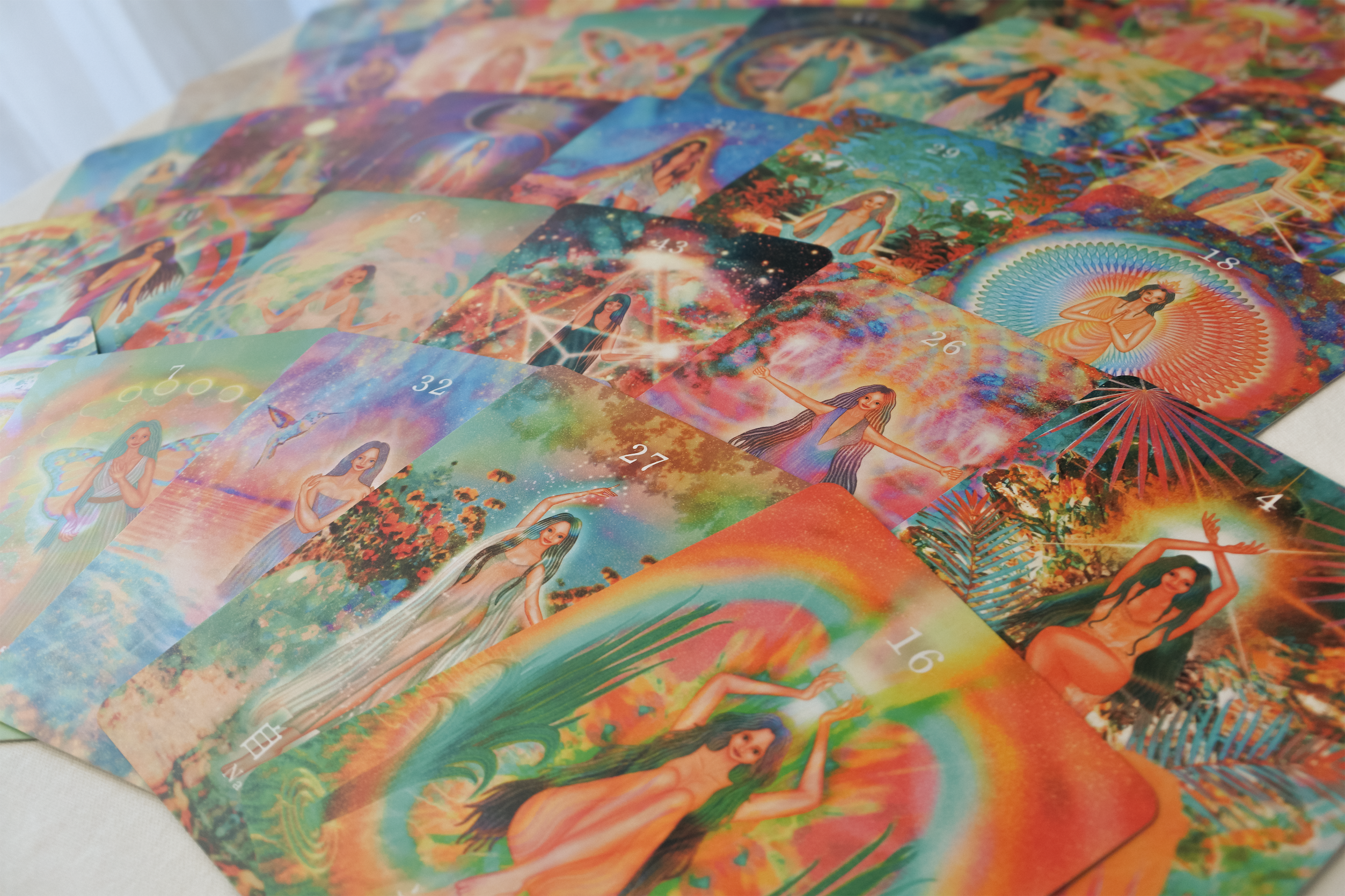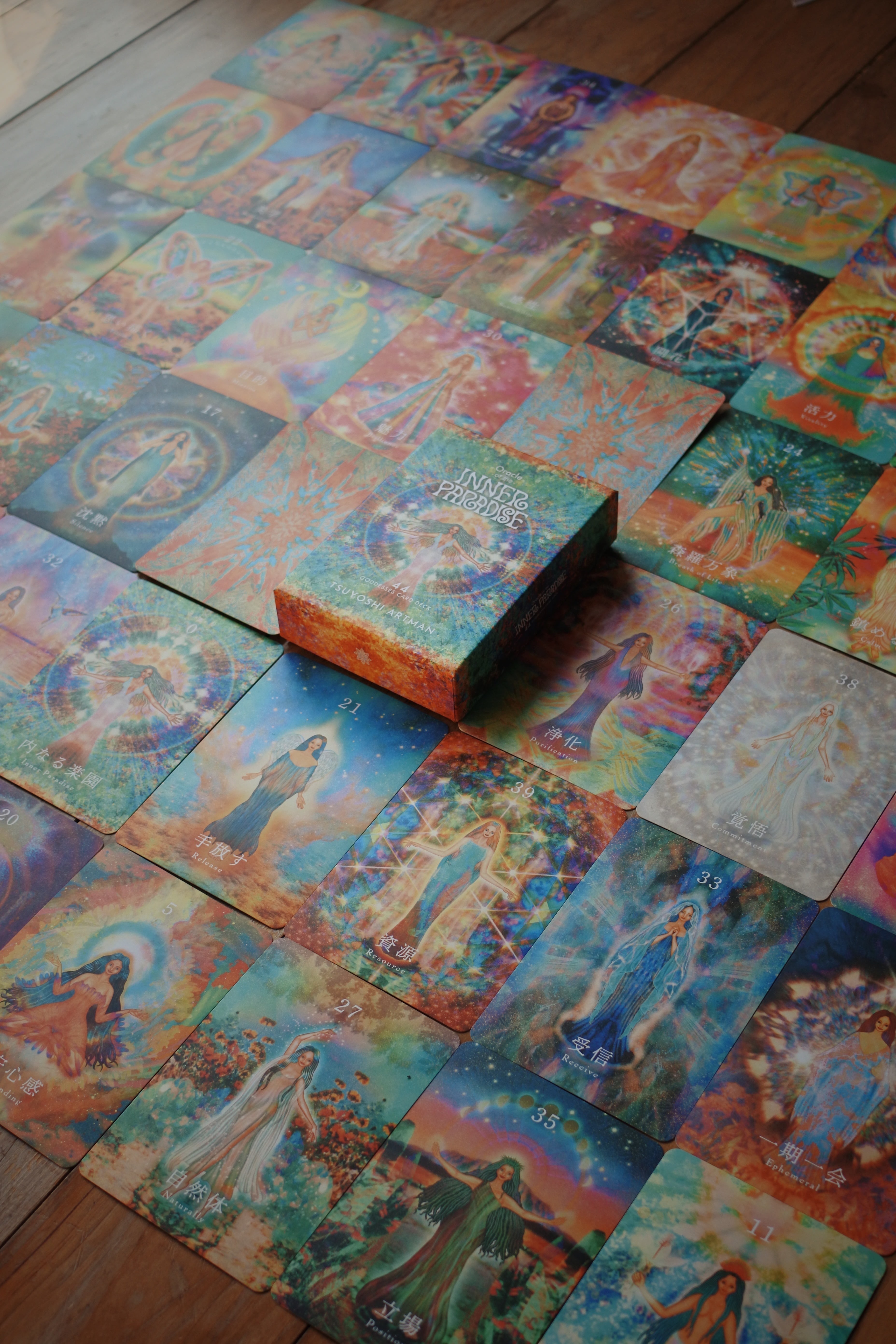 このオラクルカードは、44人の女神たちへのインタビューによってTSUYOSHI ARTMAN が1年半をかけ、心を込めて創りあげました。一人ひとりの語る内面から見えてきたそれぞれの「内なる楽園」の世界を、絵画とメッセージという形で表現した特別なカードです。